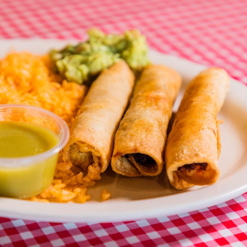 3 taquitos (chicken, beef, or potato) served with guacamole, green salsa, rice and beans